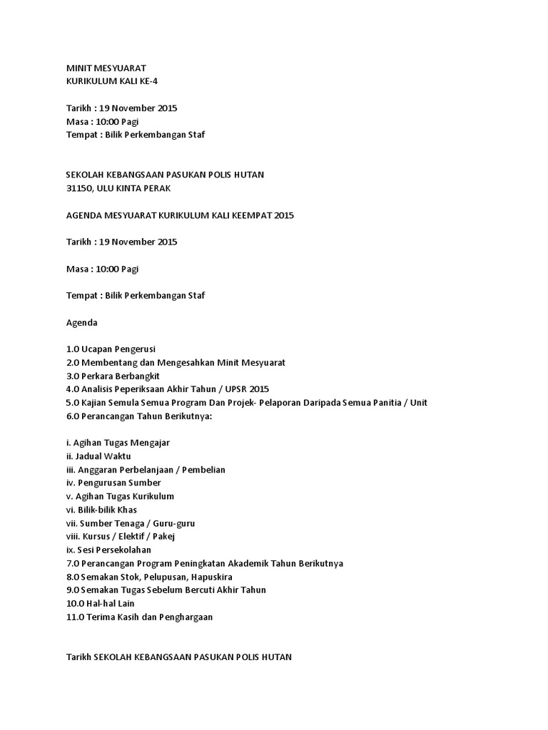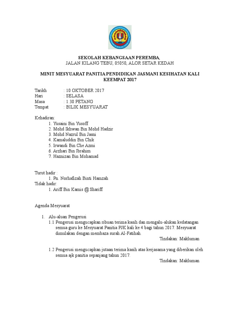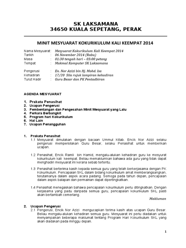 SEKOLAH KEBANGSAAN LELAKI JALAN BATU JALAN RAJA LAUT 50350 KUALA LUMPUR Minit Mesyuarat Kokurikulum Kali KeduaTahun 2017 Tarikh. 1 Minit Mesyuarat Mesyuarat Kokurikulum Kali ke 4 Tahun 2013 Tarikh. Admin January 8 2018.
